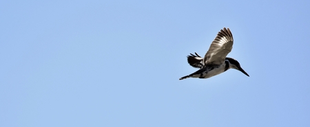 Pied kingfisher hovering over the water fishing in the Kruger National Park, South Africa.