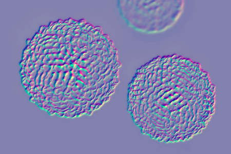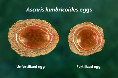 Ascaris lumbricoides, a large roundworm, unfertilized and fertilized eggs, 3D illustration