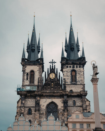 The image depicts a stunning view of a Gothic-style church with two tall, pointed towers featuring intricate architectural details. The central section of the church displays a large clock, surrounded by ornate stone carvings. To the right, a tall statue stands on a pedestal, adding to the historical and cultural significance of the scene.