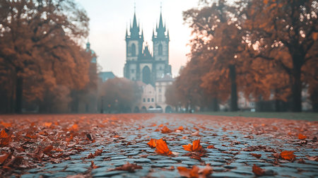 Generative AI Image of Gothic Cathedral with Prague Cobblestone Path Way at Autumn Fall Season