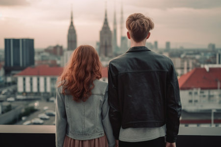 Always together Rear view of beautiful young couple bonding and looking at each other with smile while walking through the city street : Generative AI