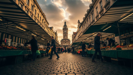 A European market square with stalls and a clock tower, bathed in warm sunset light on a cobblestone street.