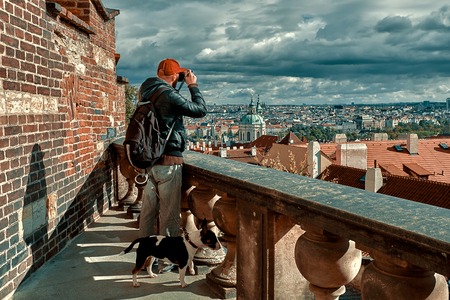 Young man with a backpack and a puppy dog is taking aerial view picture photo of the Old Town Prague, Czech Republic. Touristic travel photo conception.