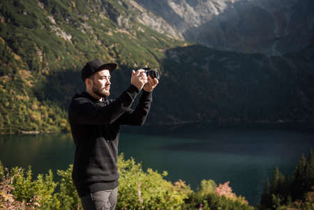 Young man photographer taking photographs with digital camera in a mountains. Travel and active lifestyle concept