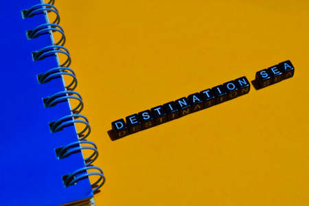 Destination sea on wooden blocks. business concept on orange background