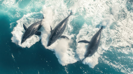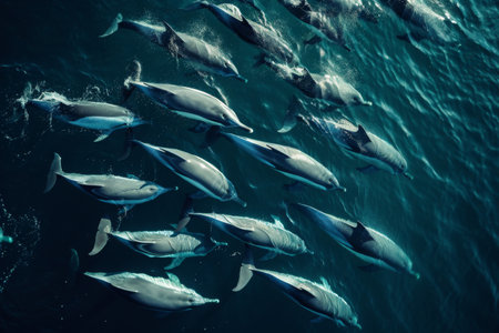 An aerial view of a dolphin pod swimming in formation, their synchronized movements creating mesmerizing patterns on the ocean's surface