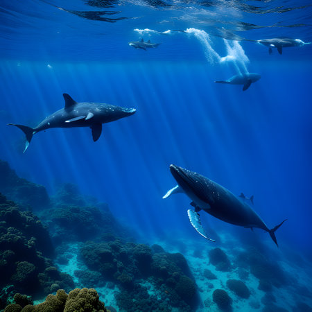 Majestic whales swimming with dolphins underwater
