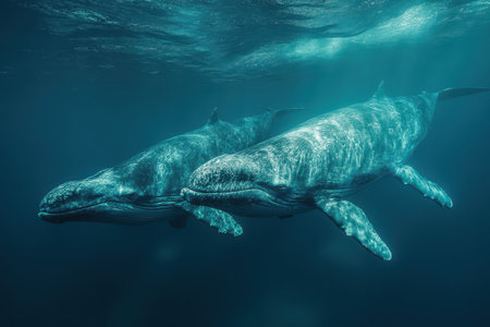 Two large whales glide through the clear ocean water, their bodies partially submerged. Sunlight filters down, creating a beautiful play of light and shadows beneath the surface.
