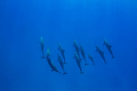 Group of dolphins swimming in the ocean. Underwater world.