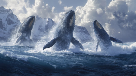 A pod of whales breaching the surface of the ocean, with massive tails and spouts creating a dramatic and awe-inspiring sight.