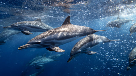 Five dolphins swimming gracefully underwater in the vibrant blue ocean, creating an enchanting scene as sun rays filter through the surface, illuminating their playful movements