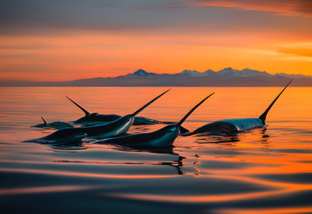 Dolphins leaping out of the water at sunset, as if celebrating the freedom and beauty of life. The image evokes a sense of wonder and awe, inviting the viewer to share in the magic of nature. Ai generated