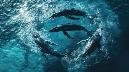 aerial view of humpback whales creating bubble net, created with generative ai