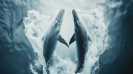 Pair of orca whales gracefully moving through the ocean waters, with an atmosphere both attractive and serene.