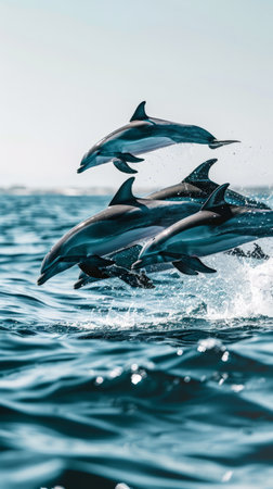 A group of dolphins are captured mid-jump, emerging from the water. The image showcases the sleek bodies and aquatic environment. The scene is illuminated by soft light, complemented by a muted color palette. The composition suggests potential use for marine life documentation and nature-themed publications.