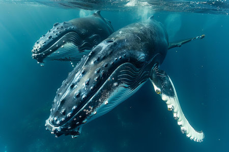 A mother whale and her calf glide together through the serene and clear blue ocean waters, highlighting their bond in natures tranquility.