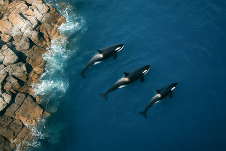 Orcas swimming gracefully in deep blue ocean near rocky coastline. concept of marine wildlife, oceanic habitat, sea animal beauty.
