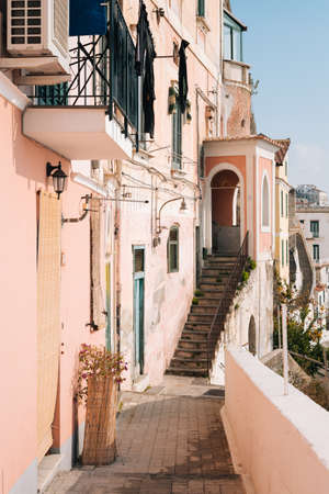 Street scene with architecture and mountains in Cetara, on the Amalfi Coast, in Campania, Italy