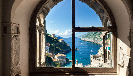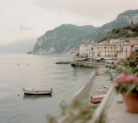 Amalfi Coast cliffside town with colorful houses and azure sea below, captured from lookout