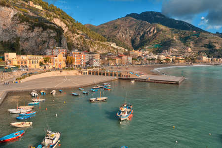 Beautiful view of Amalfi Marina Coppola port in the province of Salerno, the region of Campania, Amalfi Coast, Costiera Amalfitana, Italy