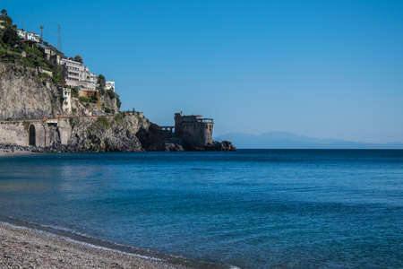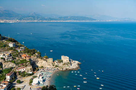 View of Cauco beach and Cerniola castle with people relaxing from hill top on sunny summer day in small village of Erchie, Amalfi, Italy