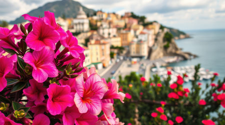 Vibrant pink flowers in full bloom overlooking a picturesque coastal town. A stunning view!