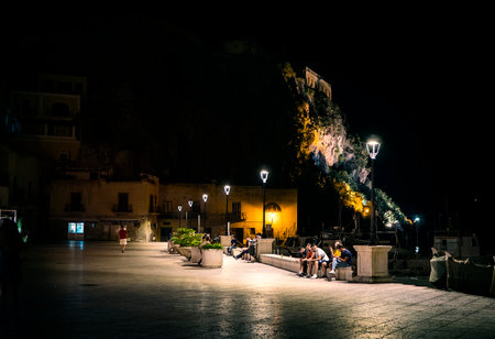 A group of people sitting on a bench at night. Photo of people enjoying a peaceful evening on a bench in Sicilys Eolie Islands