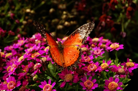 orange, black and white Common Lacewing butterfly on a purple flower