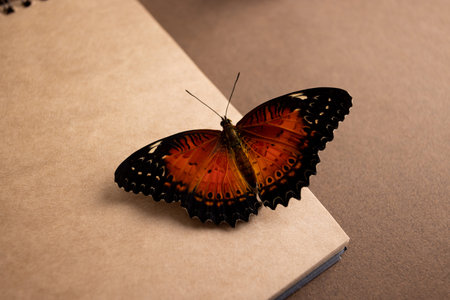 Butterfly red color still life concept on craft paper on brownbackground, vintage style post card