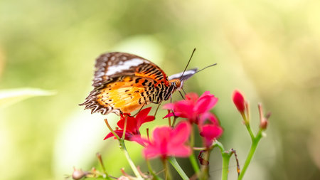 Red lacewing butterfly sitting on green leaf in morning sunlight
