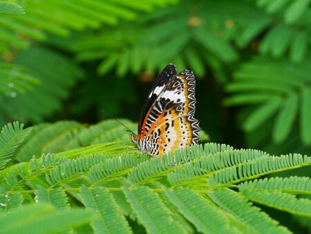 Closeup Butterfly on green leaf in the garden (The Malay Lacewing)
