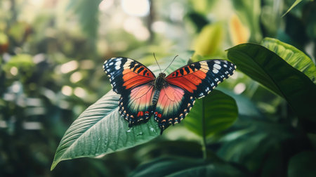 A stunning close-up of a vibrant butterfly resting on lush green leaves. Showcasing intricate wing patterns, this image captures the beauty of nature.
