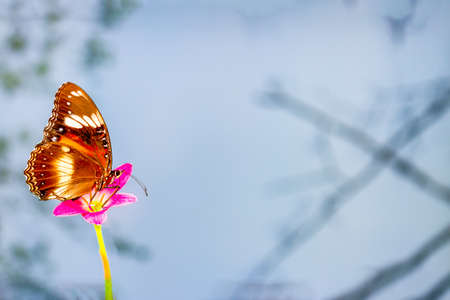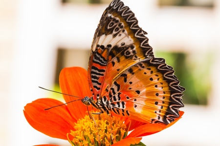 Close up of male leopard lacewing Cethosia cyane euanthes butterfly feeding on zinnia flower