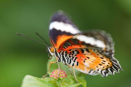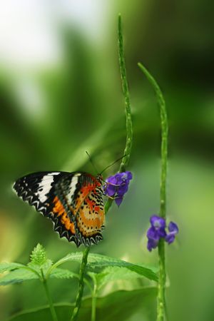 orange, black and white Common Lacewing butterfly on a purple flower