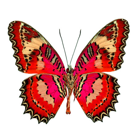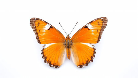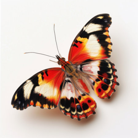 a vibrant butterfly with intricate patterns and expansive wings is captured in this meticulous and photorealistic still life photograph. the symmetrical asymmetry of the markings in red and orange adds to its visual appeal. shot on fujifilm provia, the image showcases a realist lifelike accuracy. against a white background, the layered imagery subtly conveys a touch of irony. ai generated