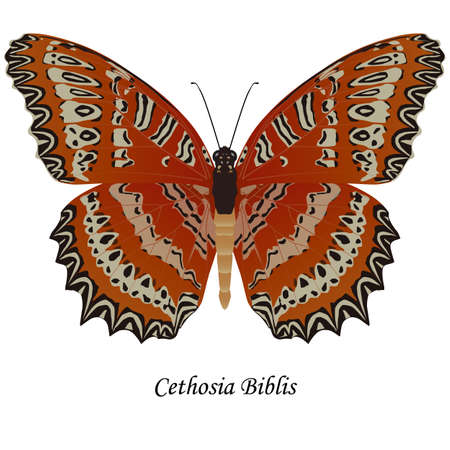 A selective focus shot of a colorful Cethosia butterfly