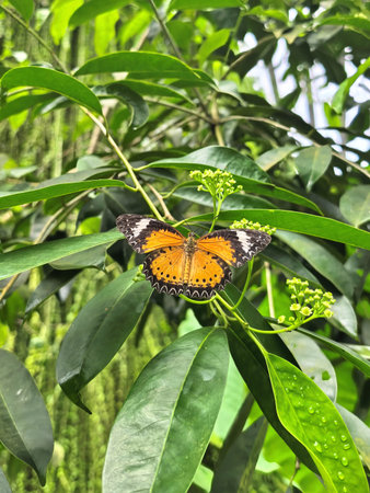 A colorful butterfly with bold orange and yellow hues accented by black patterns, perched delicately on lush green foliage amidst nature's serenity.