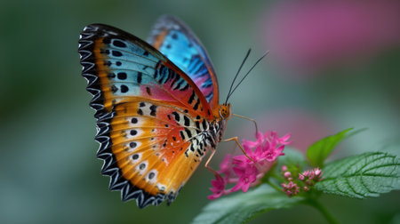 A beautifully detailed butterfly with vibrant orange and blue wings rests gracefully on a pink flower, showcasing the harmony of nature