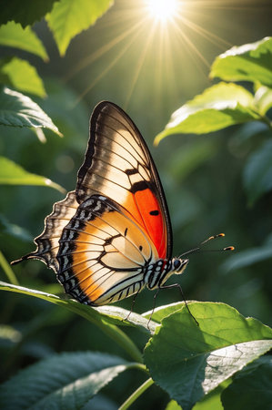 Butterfly sitting on a green leaf in the sun rays.