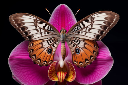 Colorful butterfly delicately perched on the stamen of a blooming orchid, its wings a kaleidoscope of colors. Beautiful insect with patterns on her wings sitting on flower close up. Generative AI
