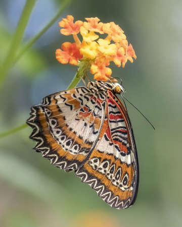 Closeup of Red Lacewing Butterfly hanging upside down while feeding on flower