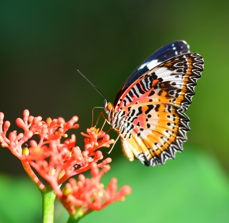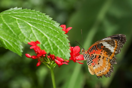 Red Lacewing butterfly Cethosia biblis sitting on a green leaf