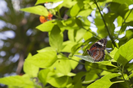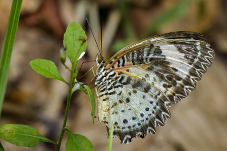 Closeup Butterfly on green leaf in the garden (The Malay Lacewing)