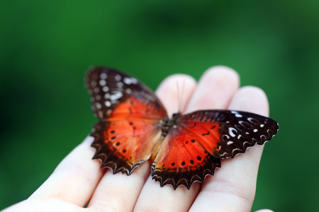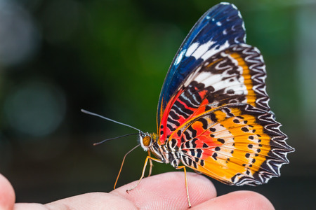 Close up of male leopard lacewing Cethosia cyane euanthes butterfly perching on human finger