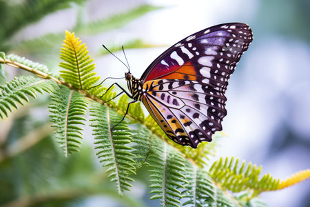 Butterfly on a fern leaf in a tropical forest.