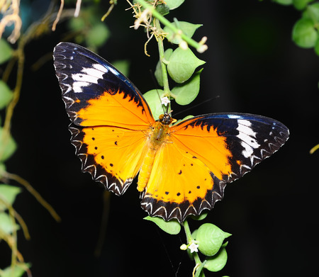 Leopard lacewing Cethosia cyane euanthes butterfly resting on plant.