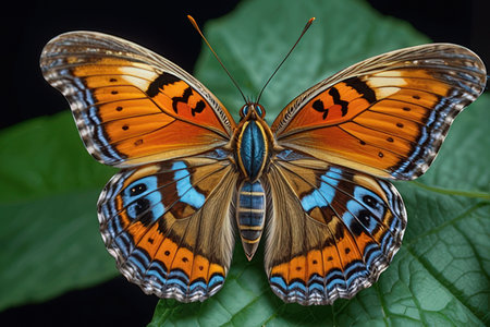 A stunning close-up of a vibrant butterfly resting on lush green leaves. Showcasing intricate wing patterns, this image captures the beauty of nature.