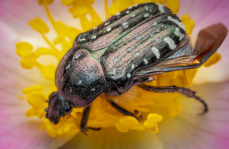 Closeup of a Rose Chafer sitting on a pink flower