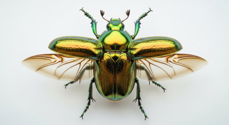 This detailed photograph showcases a vibrant, metallic beetle with its wings fully extended, presented cleanly on a plain white background.