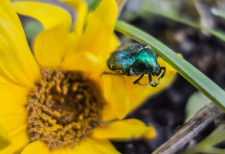 Bronzovka golden beetle on yellow flower. Bronzovka beetle insect close up. Beetles pests.